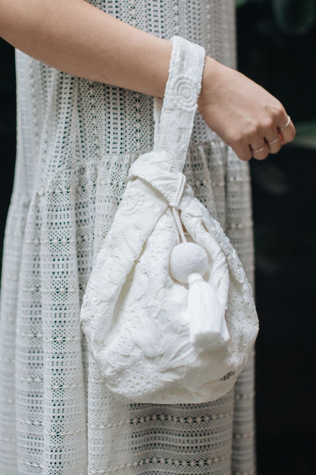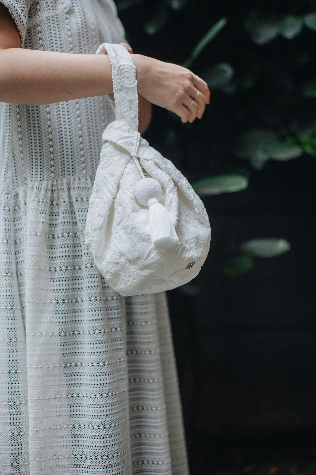 Series II features the delicate Starlit Reverie Dress, paired with THE ARIL.’s White Floral Lace Convertible Bag.