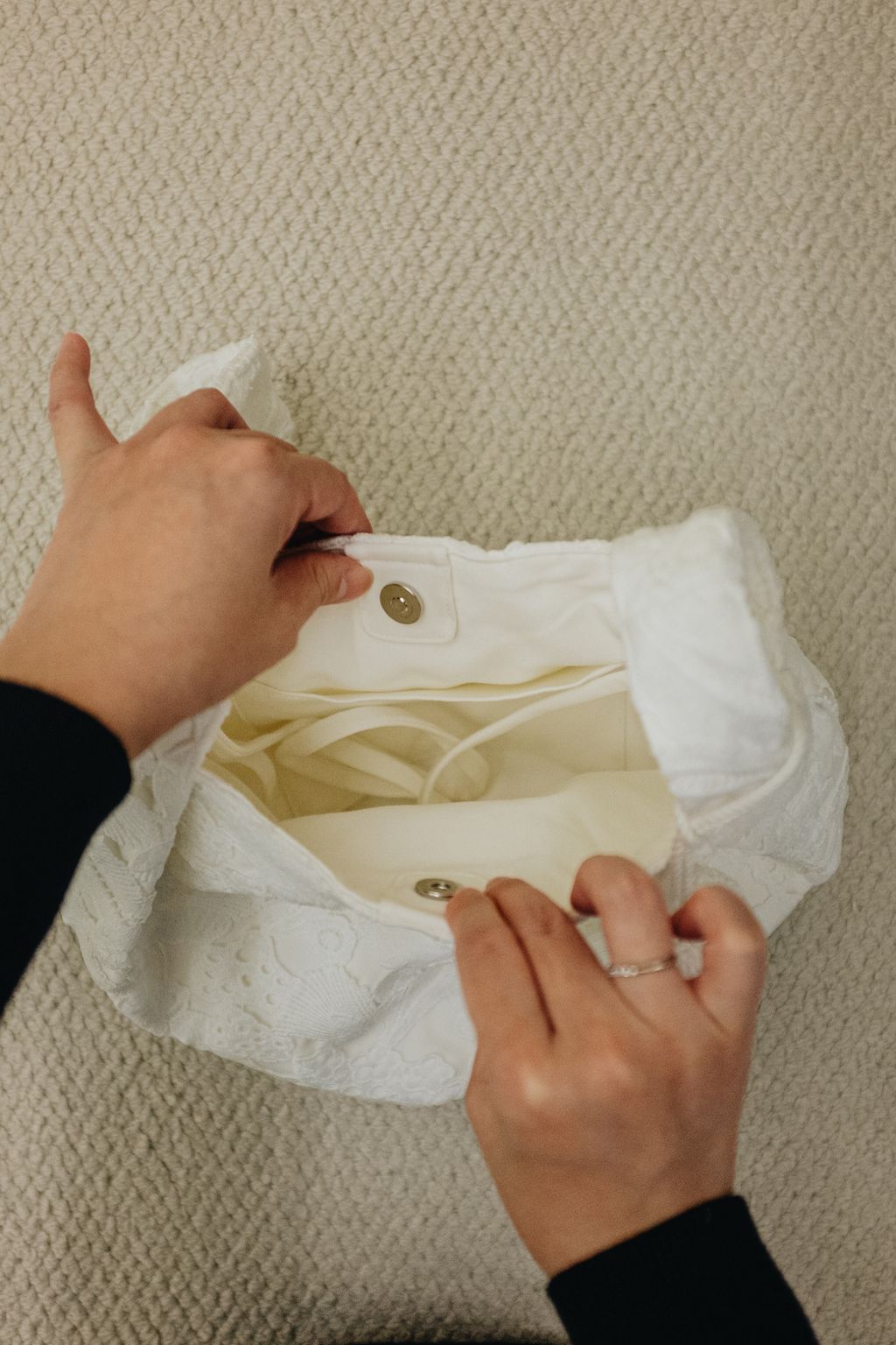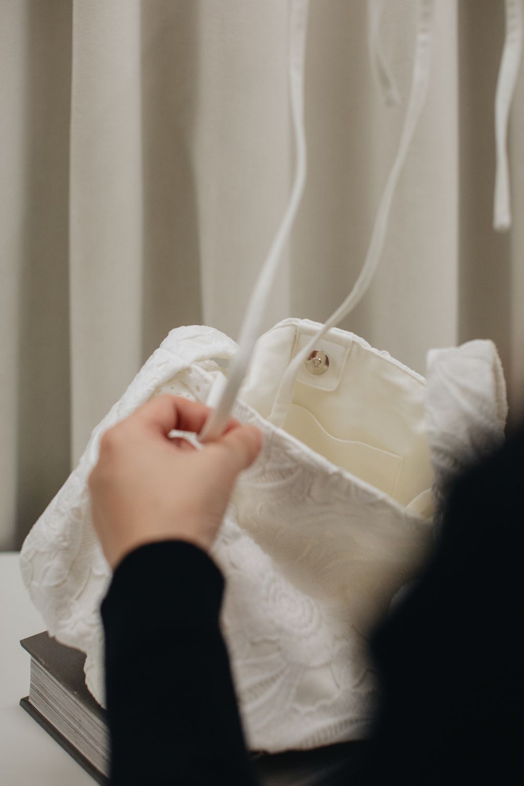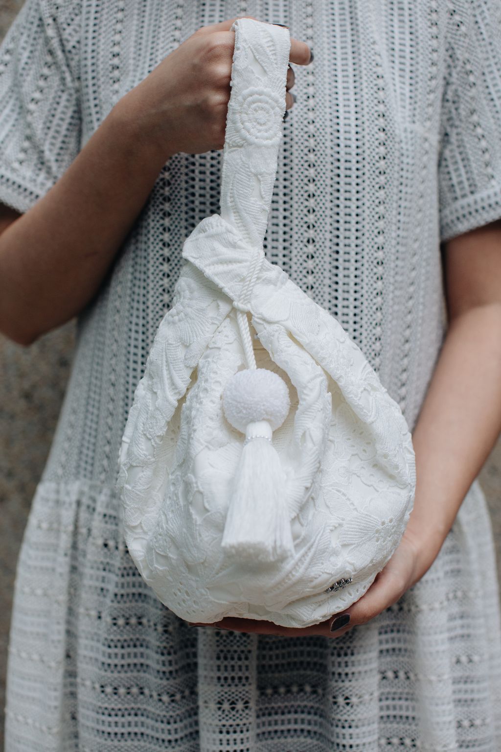 Paired with a uniquely embroidered lace bag made with exceptional craftsmanship, this piece can be carried by hand or worn over the shoulder with the attached long tie strap—bringing versatility and quiet beauty into everyday life.