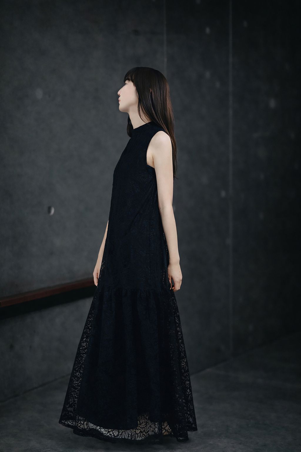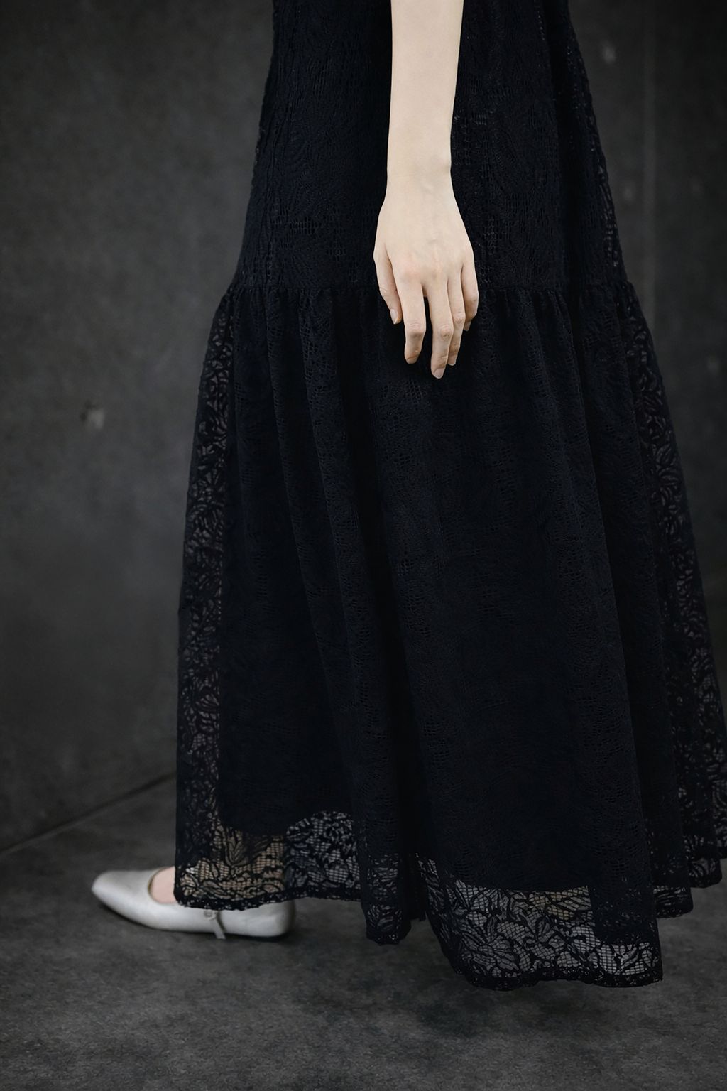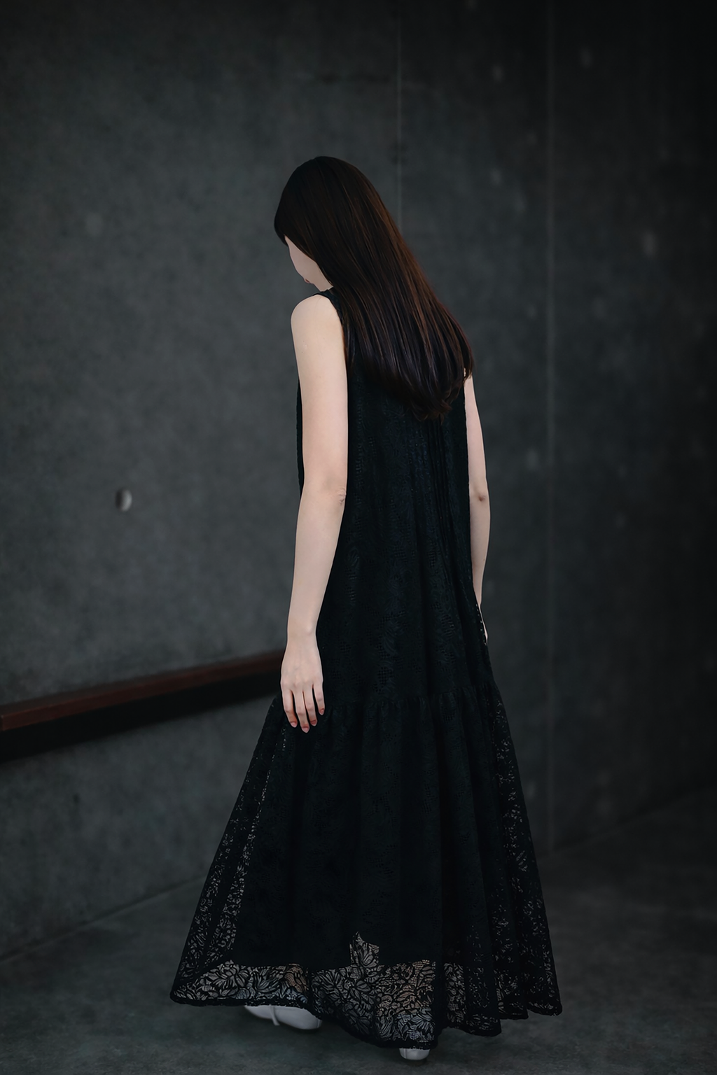 以晨曦微光為靈感,幽微知曦洋裝選用日本製精緻微立體花朵蕾絲面料,宛如花影在窗櫺間蔓延,細膩而富有豐盈之美。