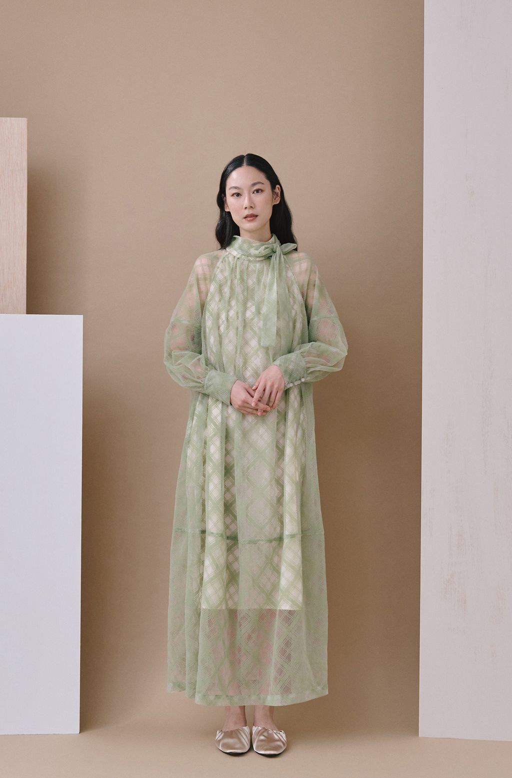 To highlight KEW.'s signature airy silhouette, we have custom-made an exclusive hazy mesh fabric with flocked checkered patterns. Paired with a light-colored lining, the two elements reflect off each other, creating a chic and refined aesthetic.