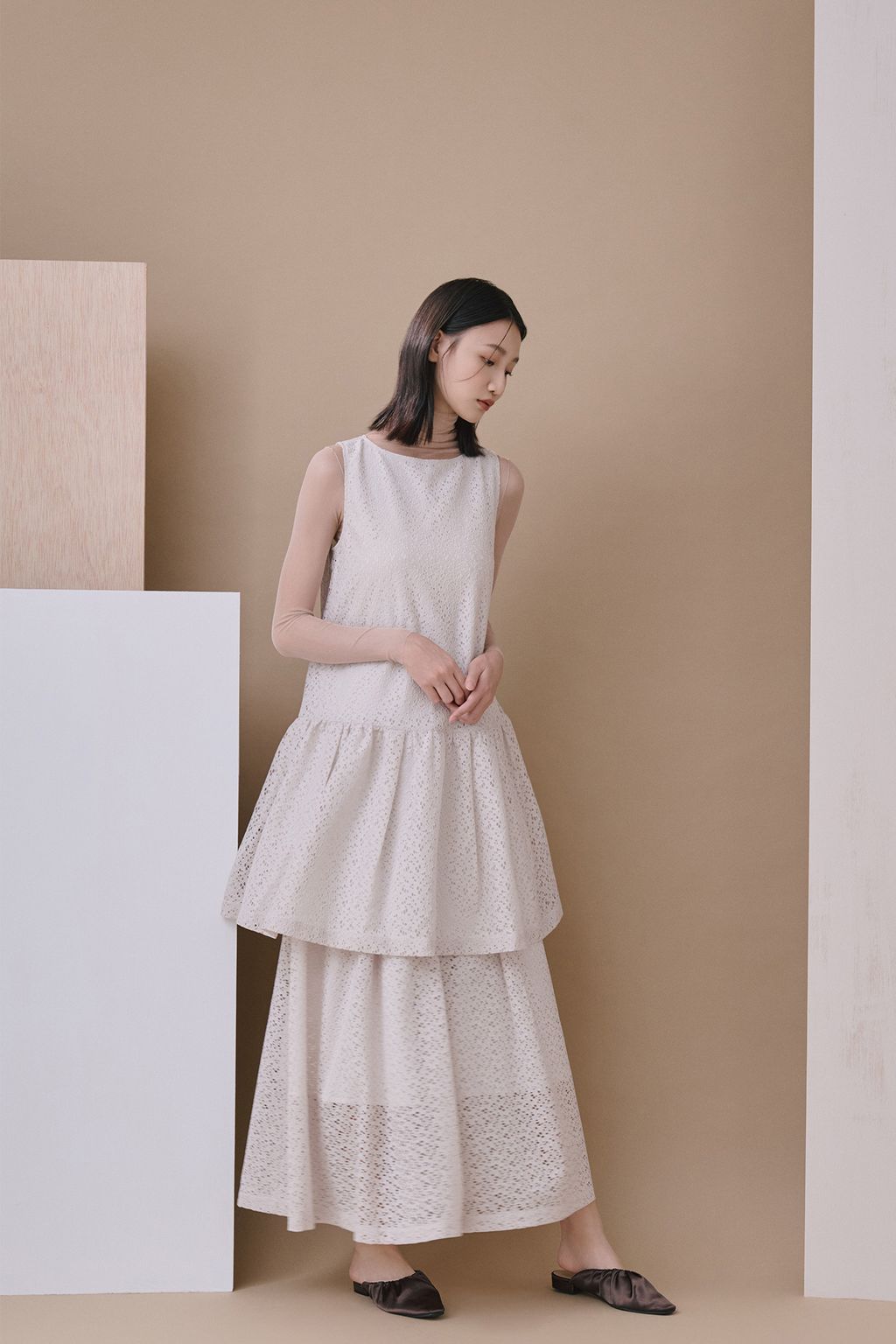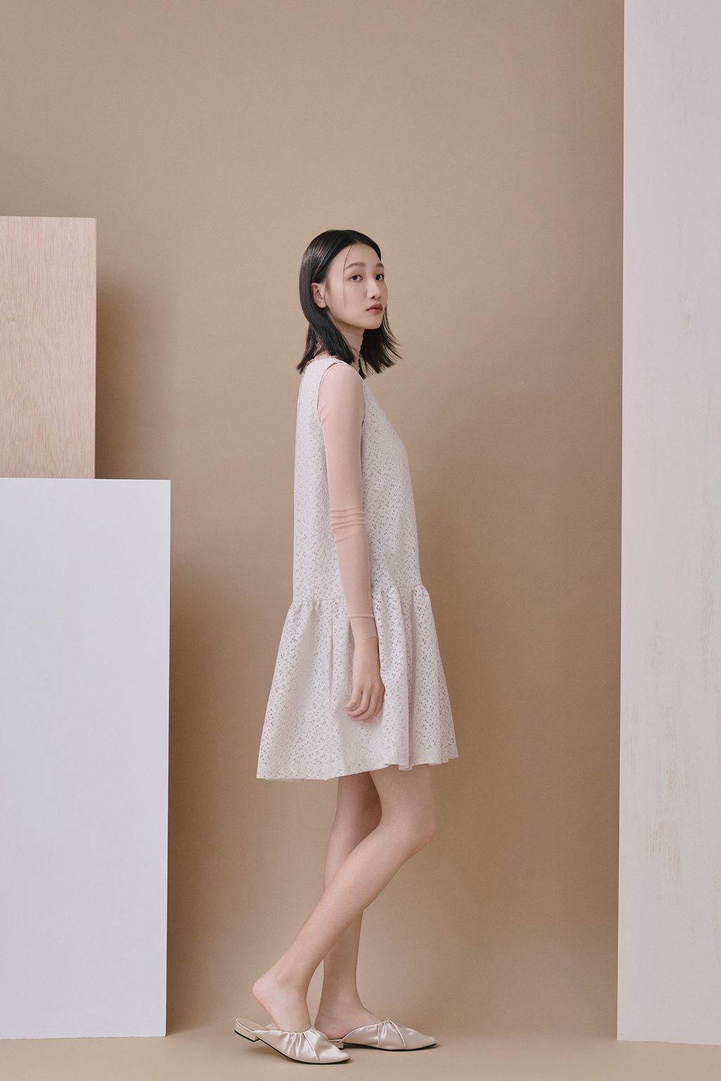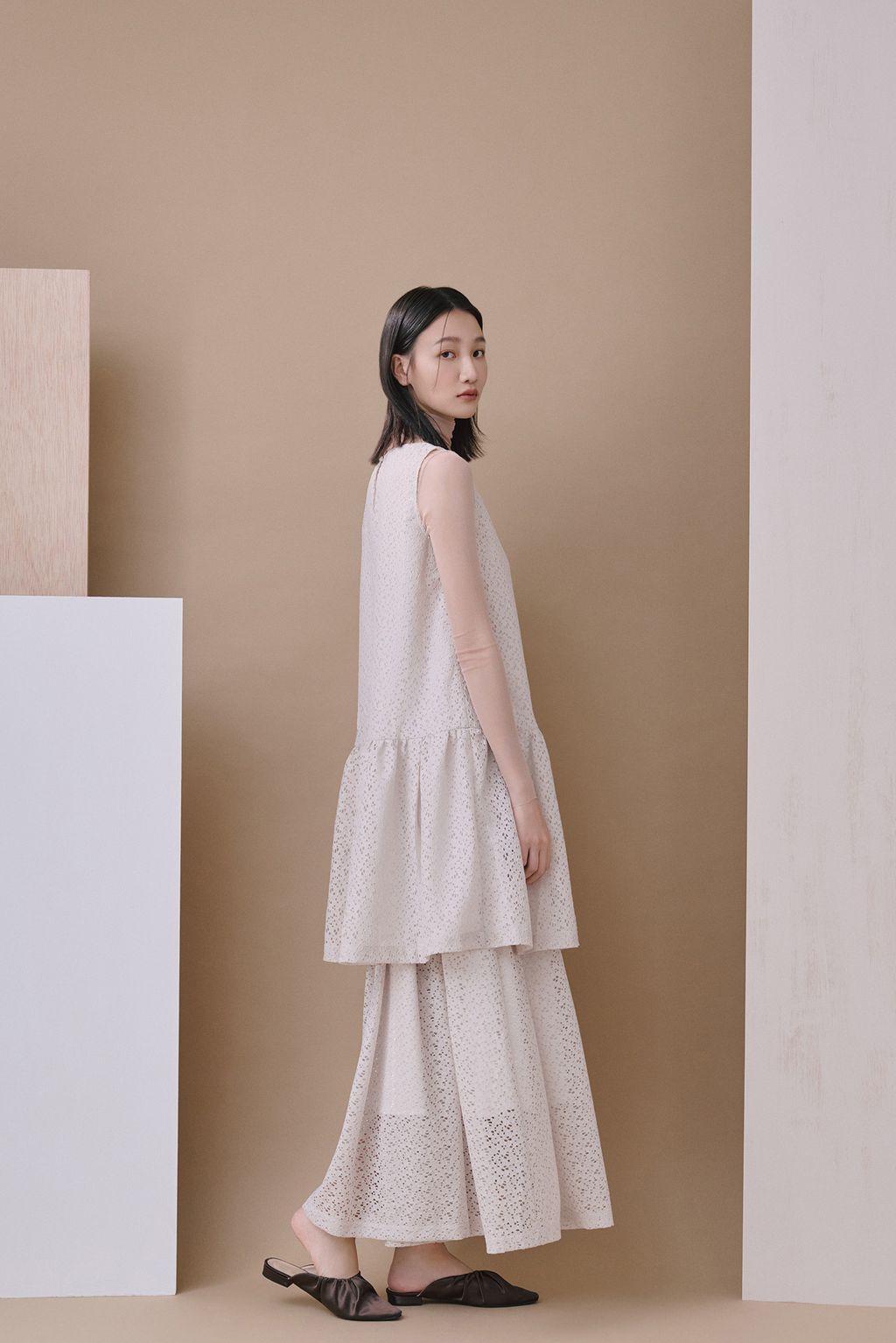 此款面料選用日本織造的輕盈鏤空花朵布料,獨特的顏色是淺杏色中、再混合一點高冷灰調,讓穿上後有著不凡的魅力。