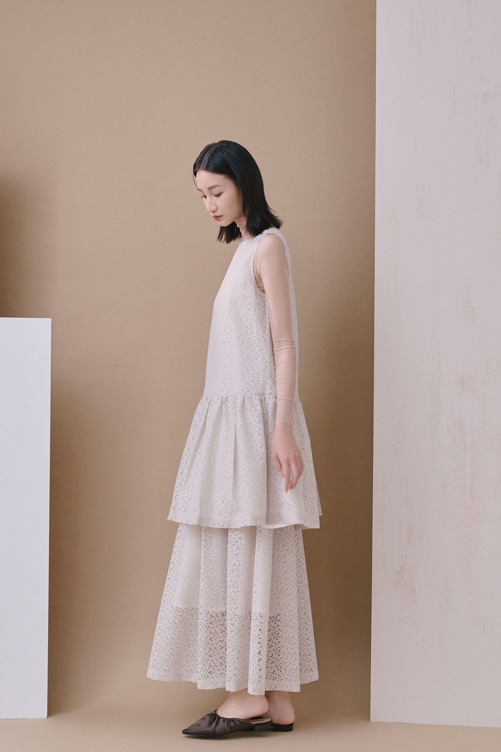With a clean, simple, fitted silhouette, the slightly dropped waistline is paired with a three-dimensional gathered skirt. The understated fullness subtly conveys an effortless sense of refined elegance. This dress is perfect on its own or layered with a pleated long skirt made from the same fabric to create a stylish, layered look.