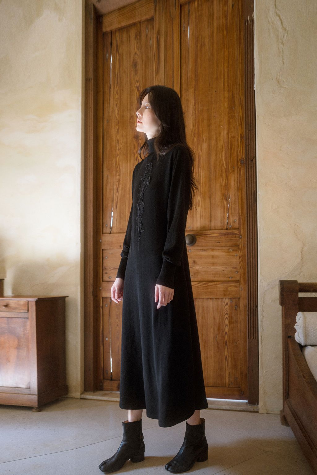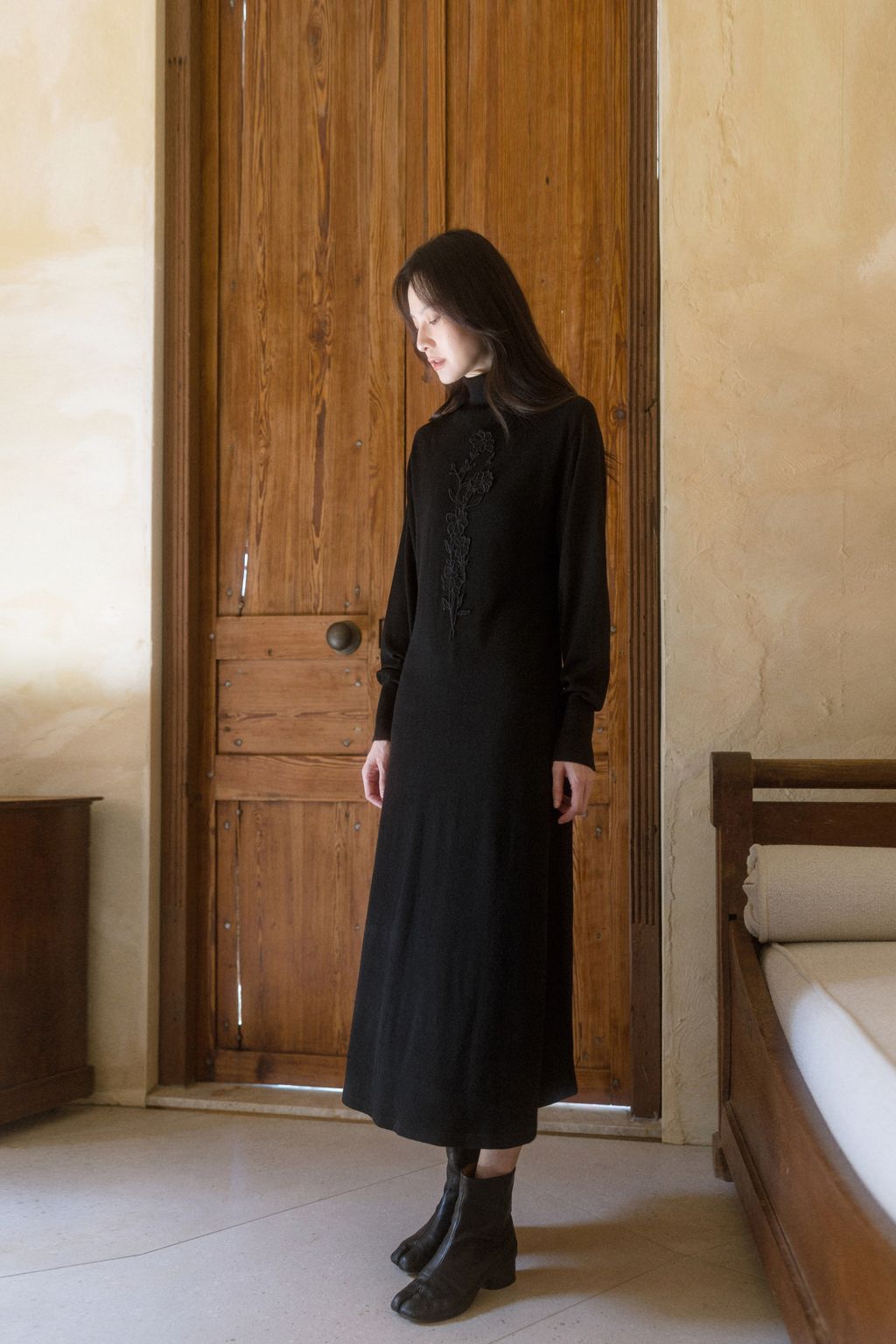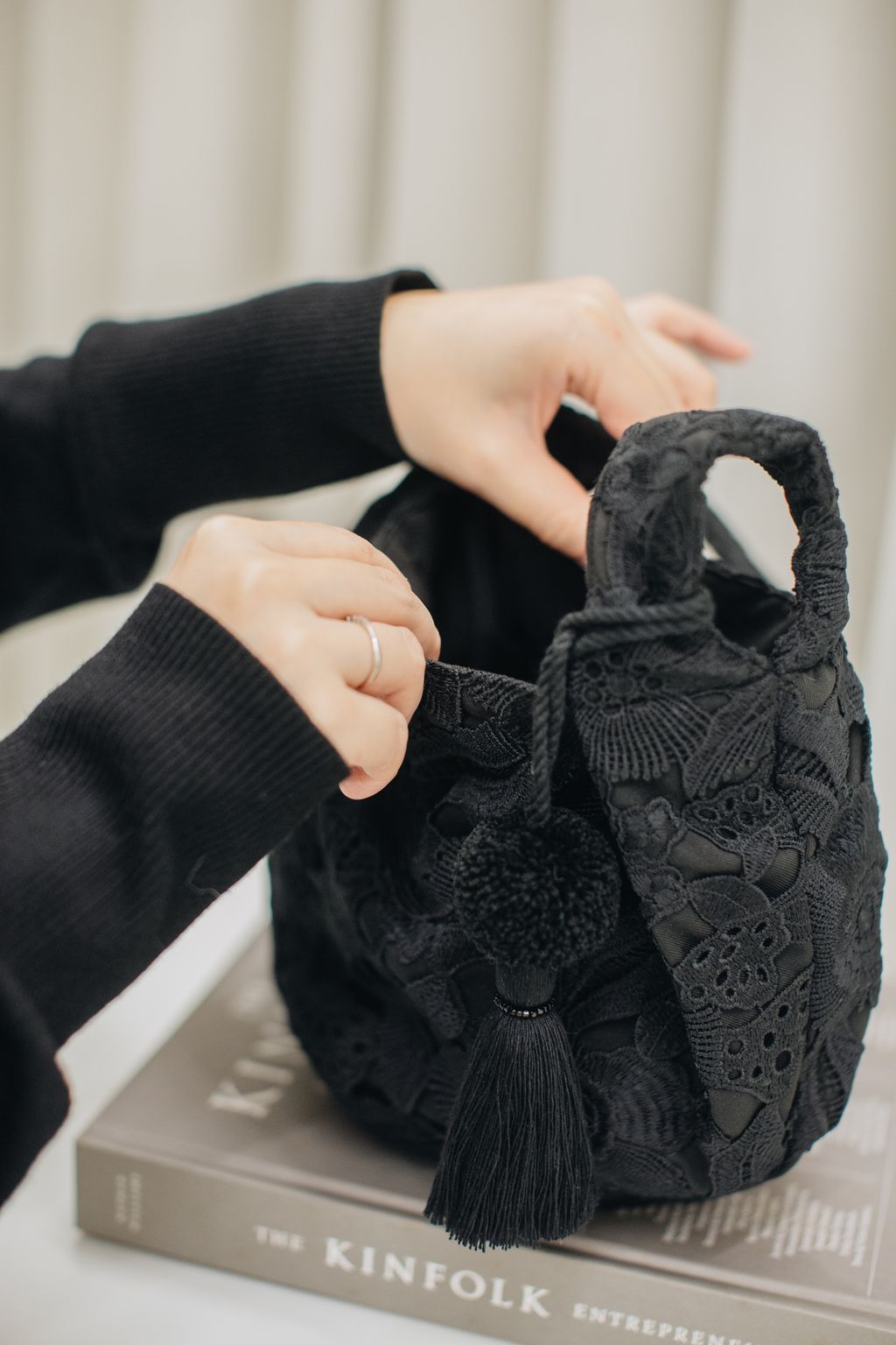 此系列三為石英黑冬之詩歌針織洋裝,搭配 𝐓𝐇𝐄 𝐀𝐑𝐈𝐋. 推出的黑色花卉蕾絲多變包。
