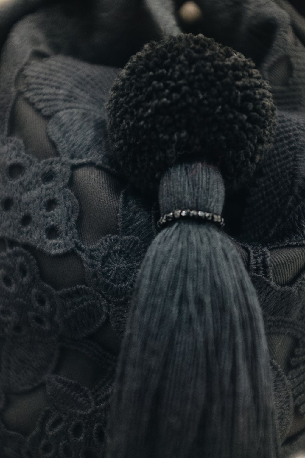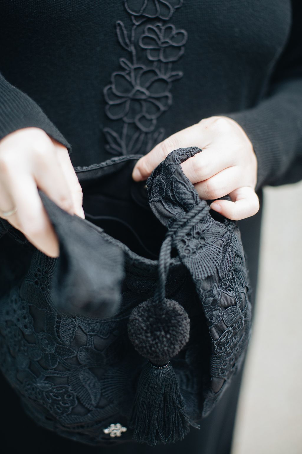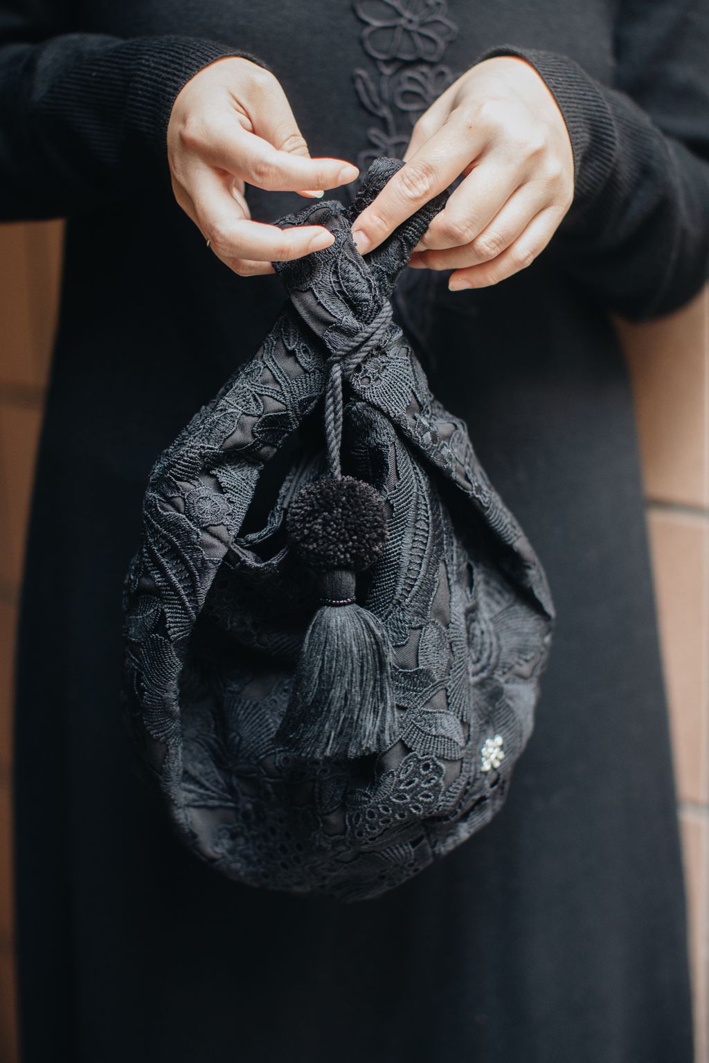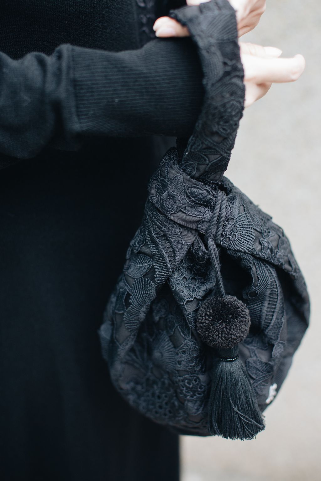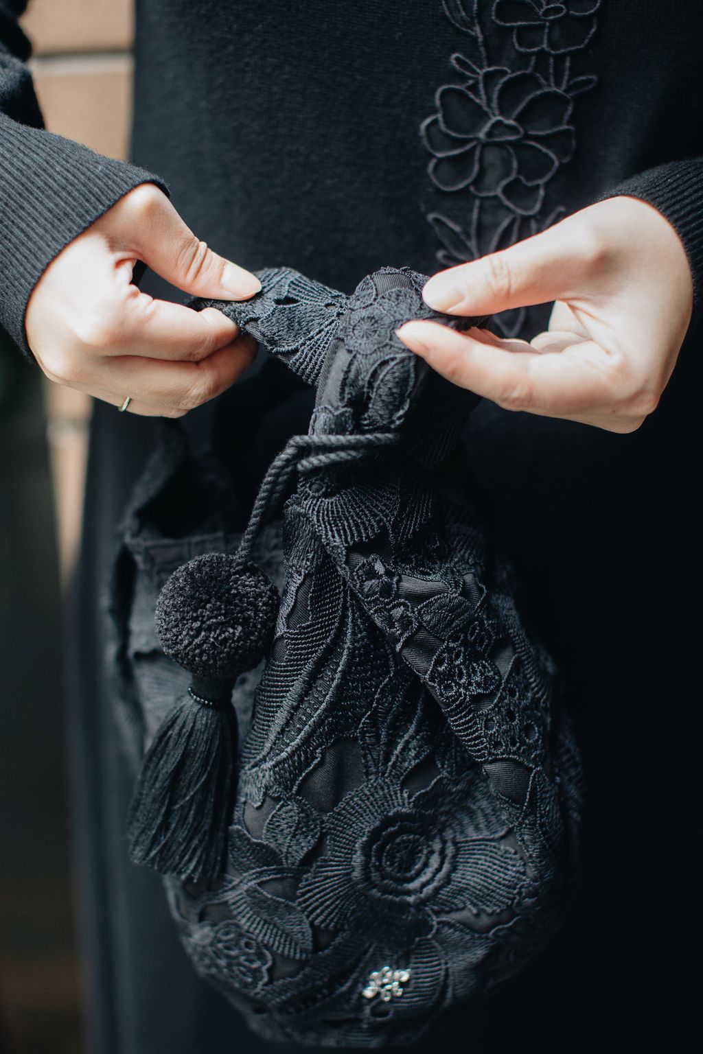 Paired with a uniquely embroidered lace bag made with exceptional craftsmanship, this versatile piece can be carried by hand or worn over the shoulder with the attached long tie strap—allowing the refined shade of quartz black to flow beautifully through everyday moments.