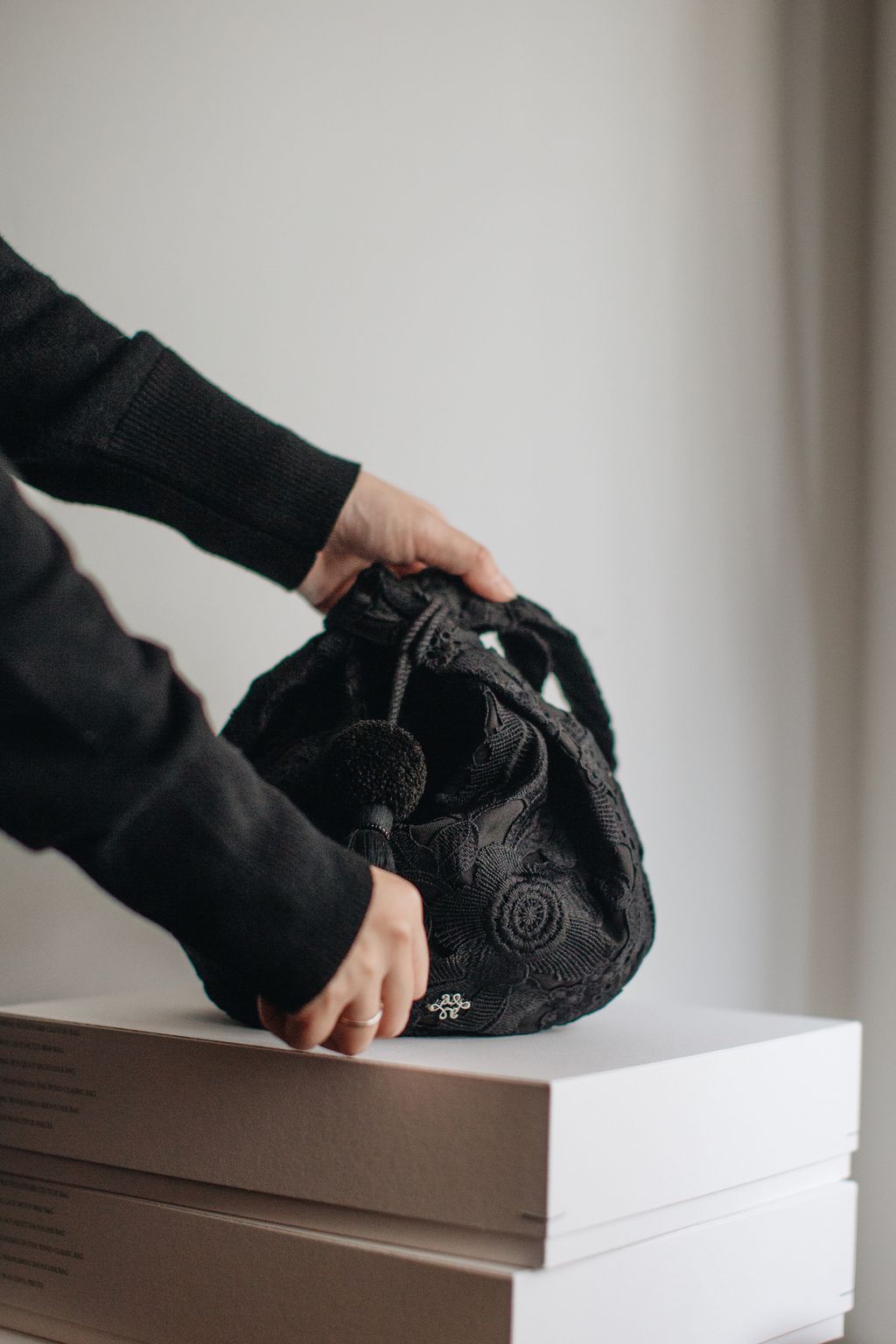 Series III features the Quartz Black Winter Poem Knit Dress, paired with THE ARIL.’s Black Floral Lace Convertible Bag.