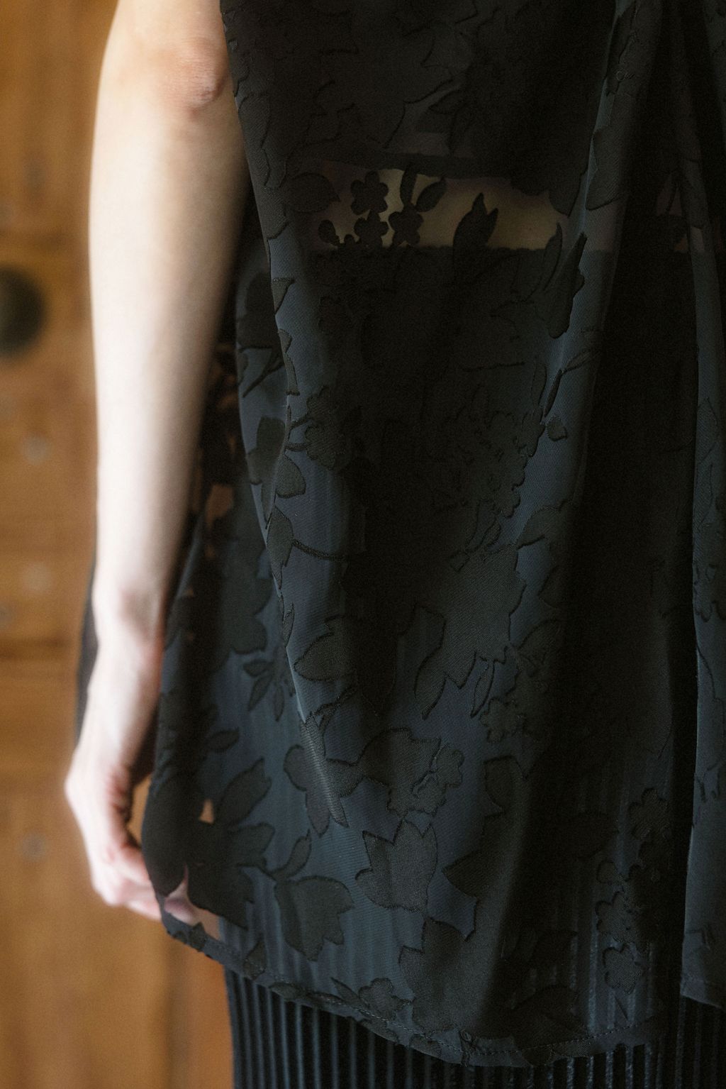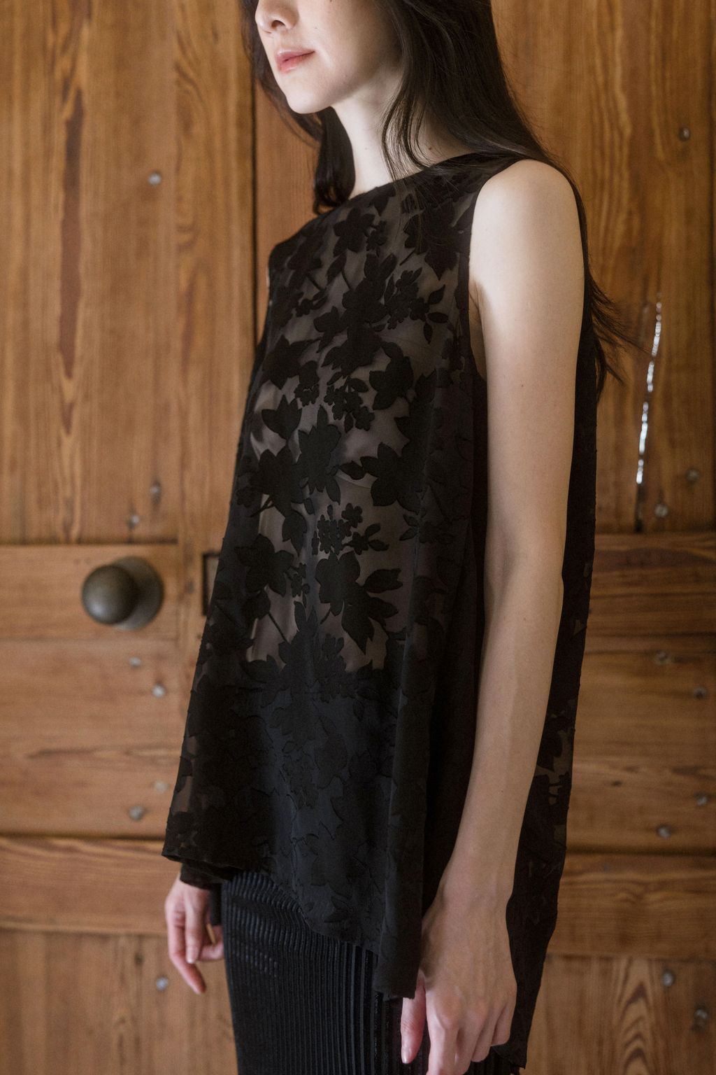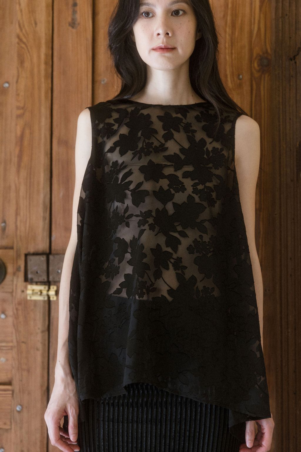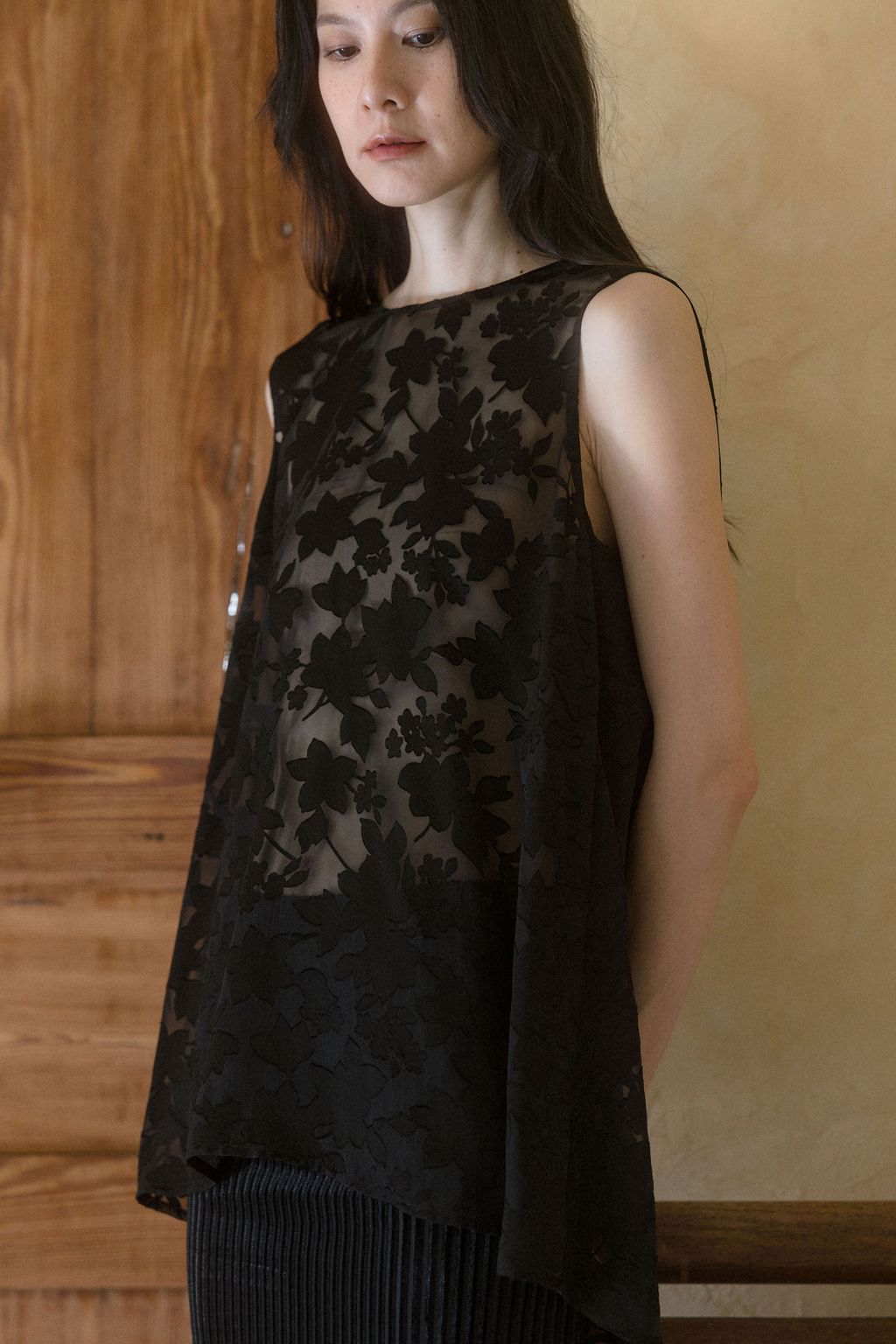 以日本獨特細緻的燒花花卉布料製作,布料帶有細緻柔順的垂墜特性,輕盈優美的花朵躍然於布料之上,呈現氣質之感。無內裡設計讓穿著更為透氣舒適,適合層疊搭配。只需一件上衣的妝點,就能呈現出不朽的氣質樣貌。