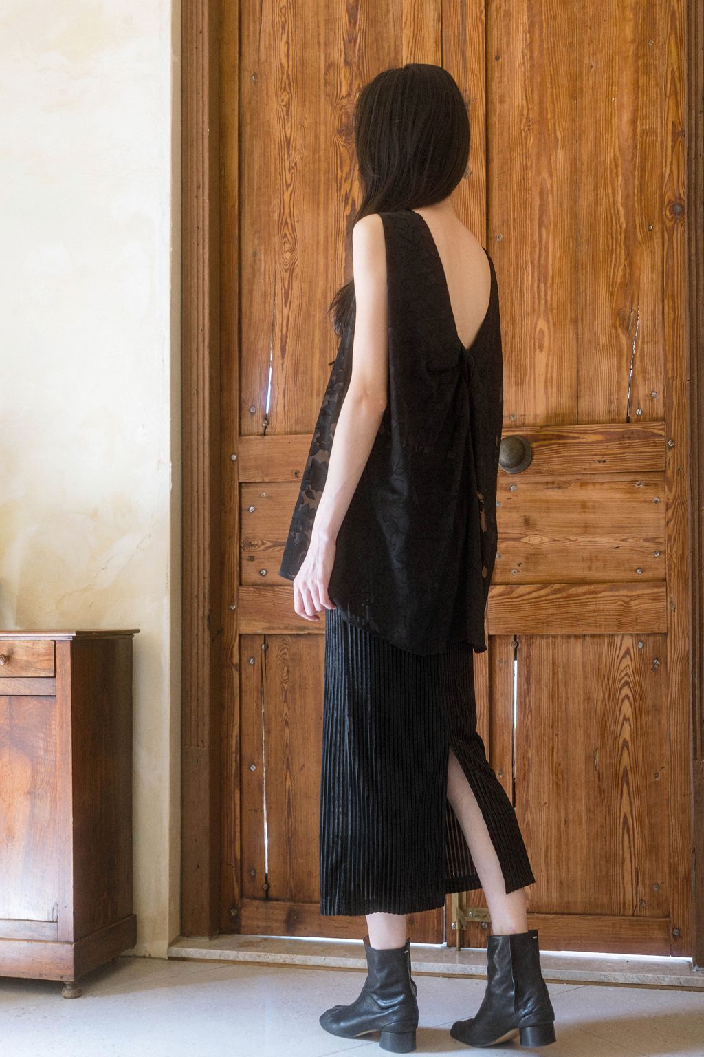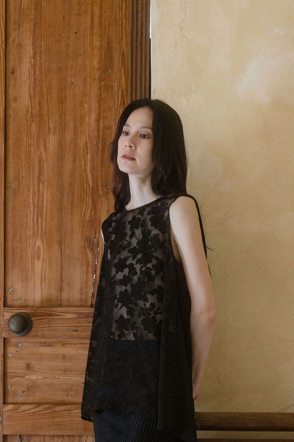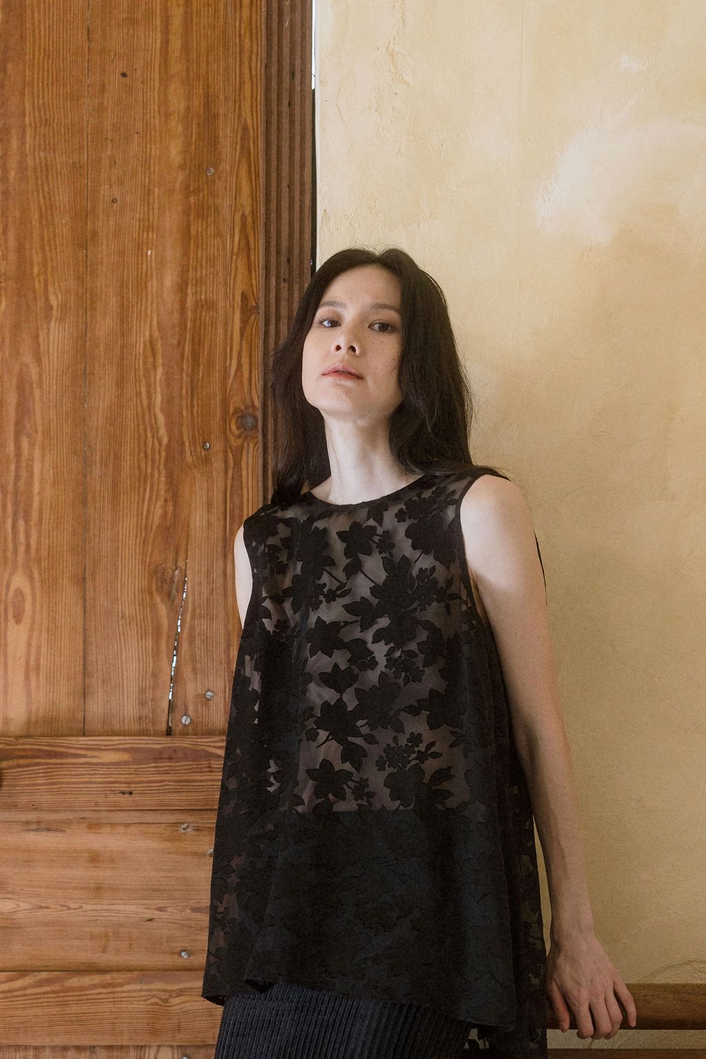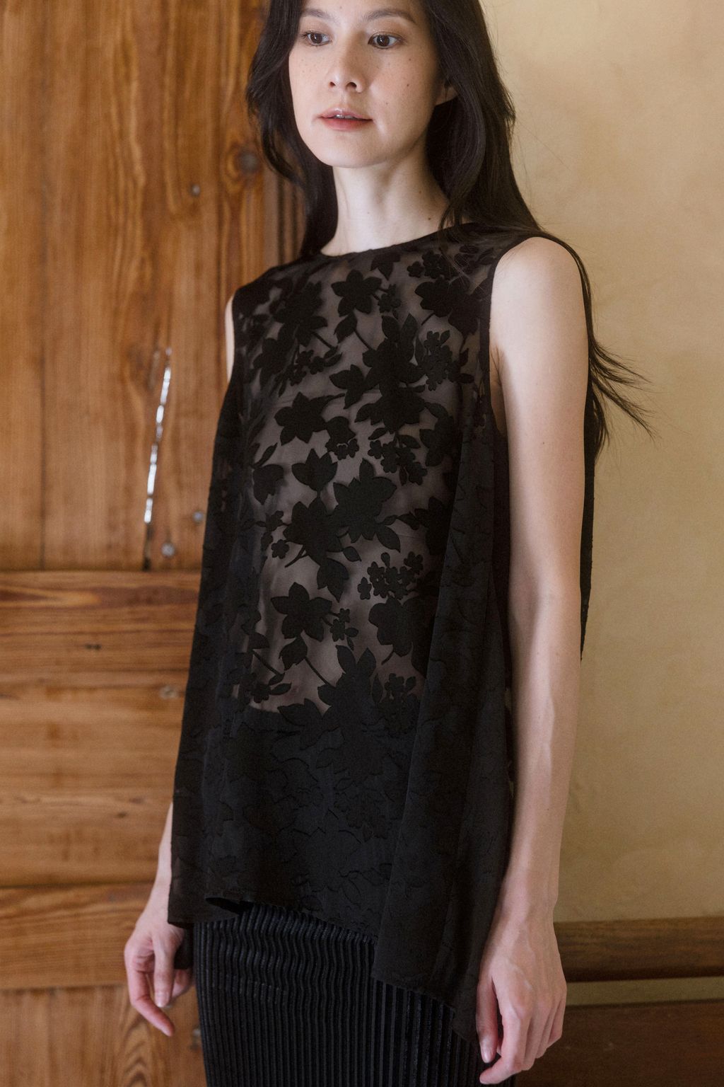 以日本獨特細緻的燒花花卉布料製作,布料帶有細緻柔順的垂墜特性,輕盈優美的花朵躍然於布料之上,呈現氣質之感。無內裡設計讓穿著更為透氣舒適,適合層疊搭配。只需一件上衣的妝點,就能呈現出不朽的氣質樣貌。