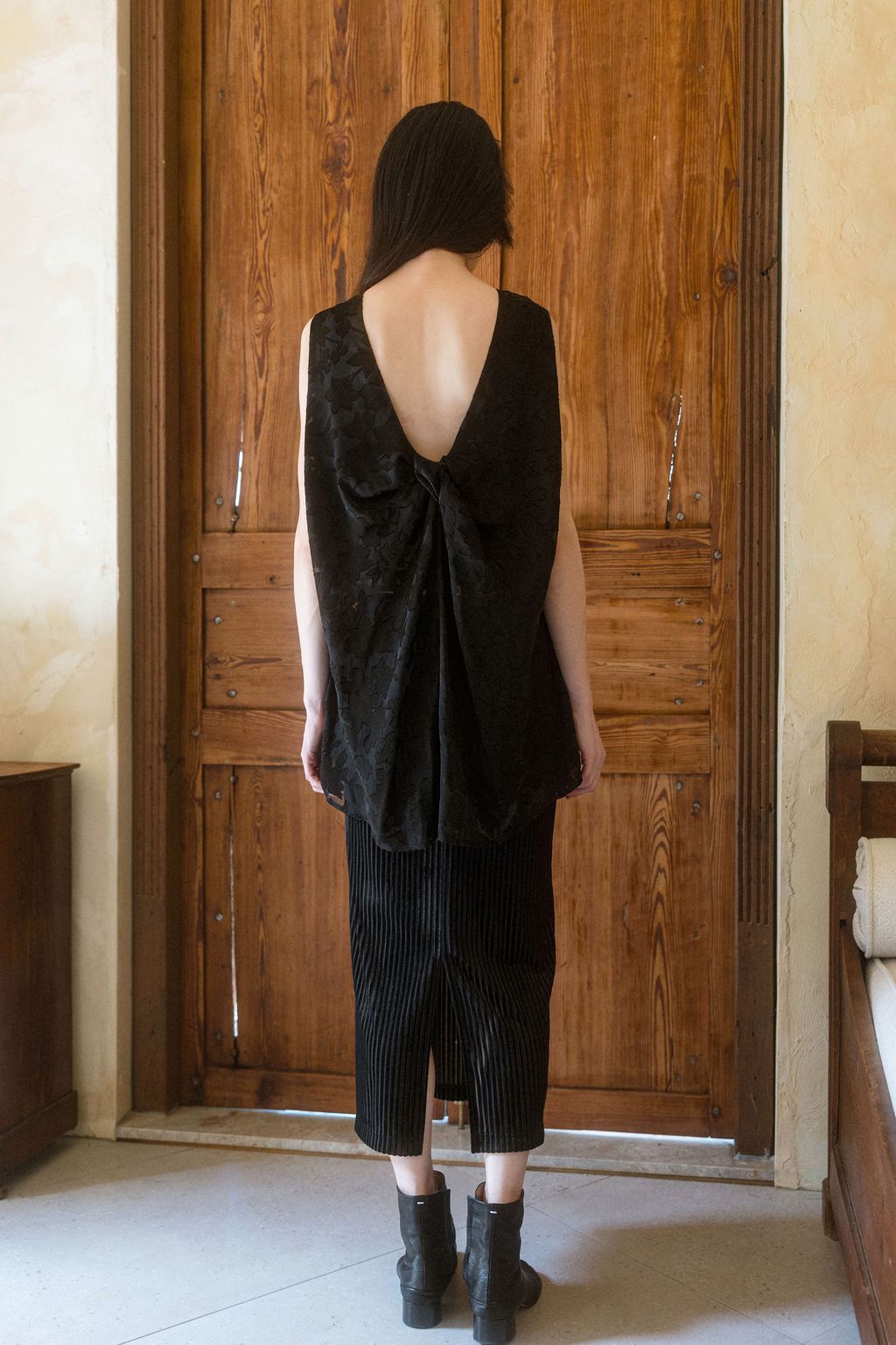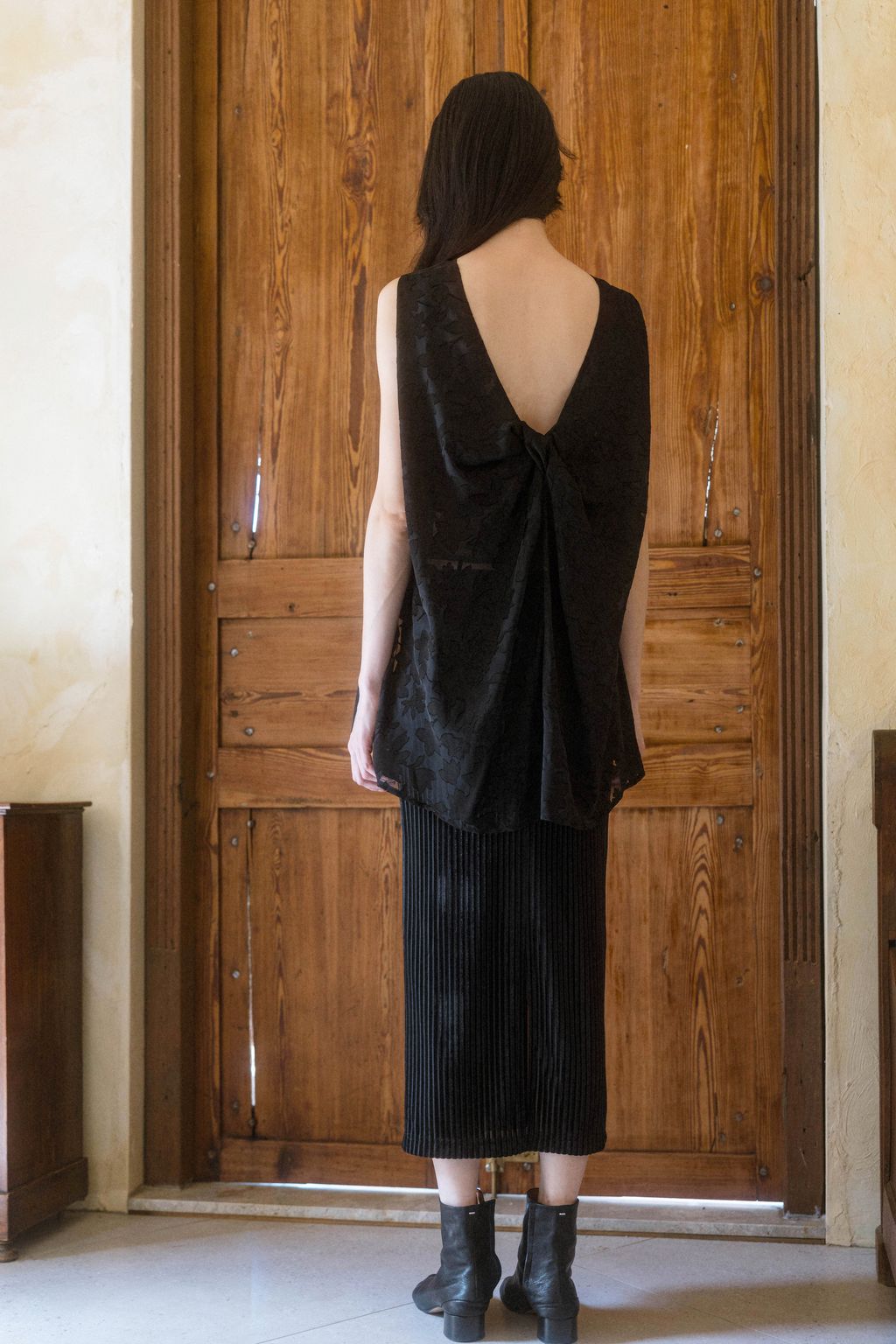 A fashion-forward blouse designed with three-dimensional tailoring — a timeless piece meant to stay in your wardrobe throughout the seasons. The twisted detail at the back is the highlight of the design, adding a subtle touch of sophistication and creating graceful lines that move naturally with each step. The refined cut enhances the silhouette, giving a sleek and elongated look.