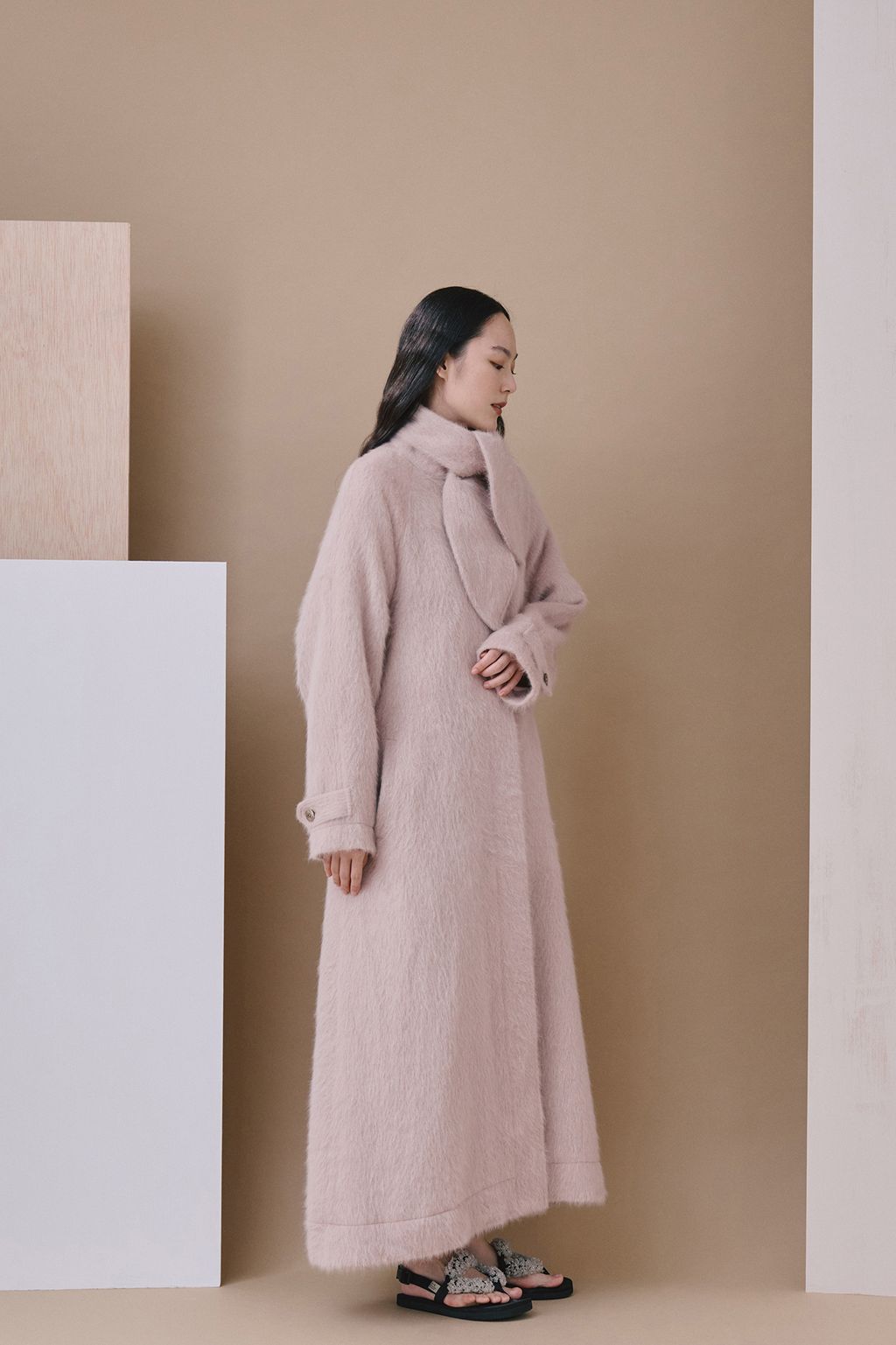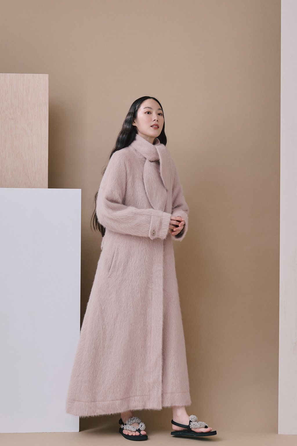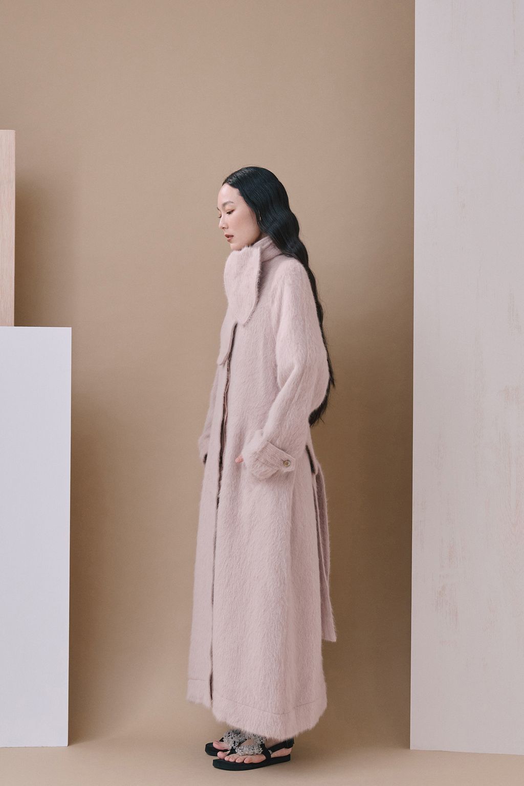 Featuring a sleek and refined silhouette inspired by Nordic minimalism, paired with a relaxed and versatile belt design, it offers endless styling possibilities. The collar can be turned up to become a wind-blocking high neck, and with the addition of the scarf, it transforms into a look of timeless elegance.